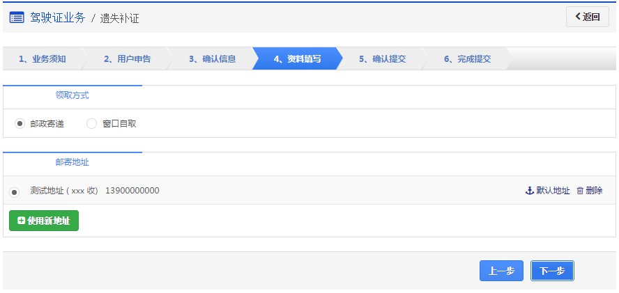在该步骤,用户选择领取方式是邮政寄递或窗口自取。业务成功受理后,如果选择邮政寄递的,邮政人员将上门收取费用,交付机动车驾驶证及收费票据。如果选择窗口自取的,则自行到选择的自取网点窗口领取机动车驾驶证。