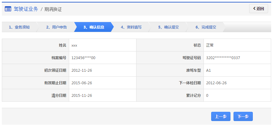在该步骤,界面显示驾驶证的基本信息,用户认真确认各项信息无误后,点击“下一步”进入步骤4【资料填写】。