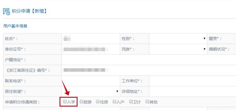 8.根据页面提示,在输入框内填写个人基本信息,打*号的为必填信息项目,请根据积分申请公共服务类别勾选相应项目,如申请积分入学的,请在待遇类别中勾选“入学”。