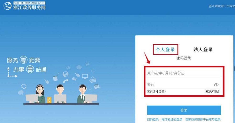 2.点击右上角“登录”→“个人登录”,如没有浙江省政务服务网账号,请先进行注册(点击个人登录页面下面“去注册”,按照提示进行注册即可),已有账号的,可直接进行登录。