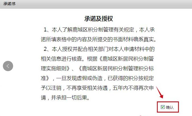7.页面中间跳出“承诺书”窗口,请再窗口中先勾选“确认”,再点击确定。