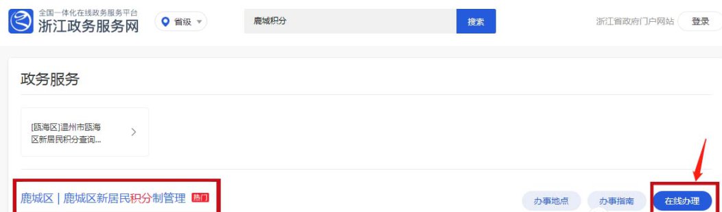 4.搜索结果中出现“鹿城区新居民积分制管理”,请点击右侧的“在线办理”按钮。