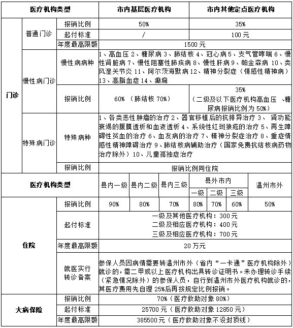 注:2022年1月1日起,温州市将全面实行基本医疗保险市级统筹,市级统筹后的城乡医保待遇如有调整,将另行公布。