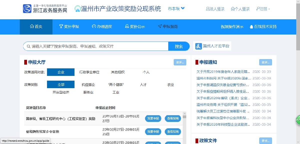 二、在线申报流程在浙江政务网http://www.zjzwfw.gov.cn/zjservice/front/index/page.do?webId=28登记注册法人身份后,登录温州市产业政策奖励兑现系统;