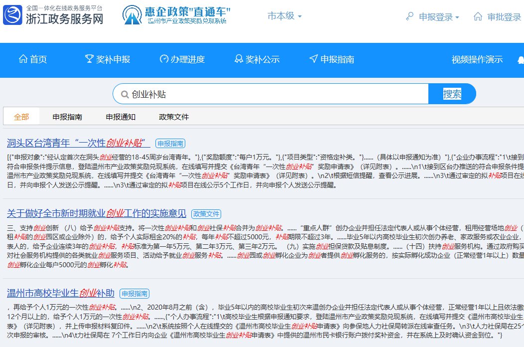 登录温州市产业政策奖励兑现系统(reward.wenzhou.gov.cn)搜索“温州市高校毕业生就业补贴”