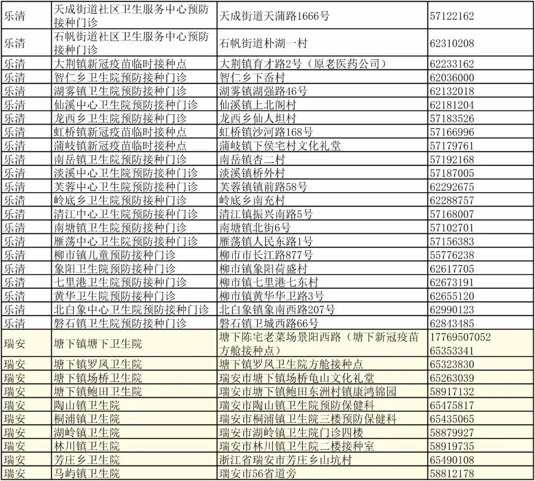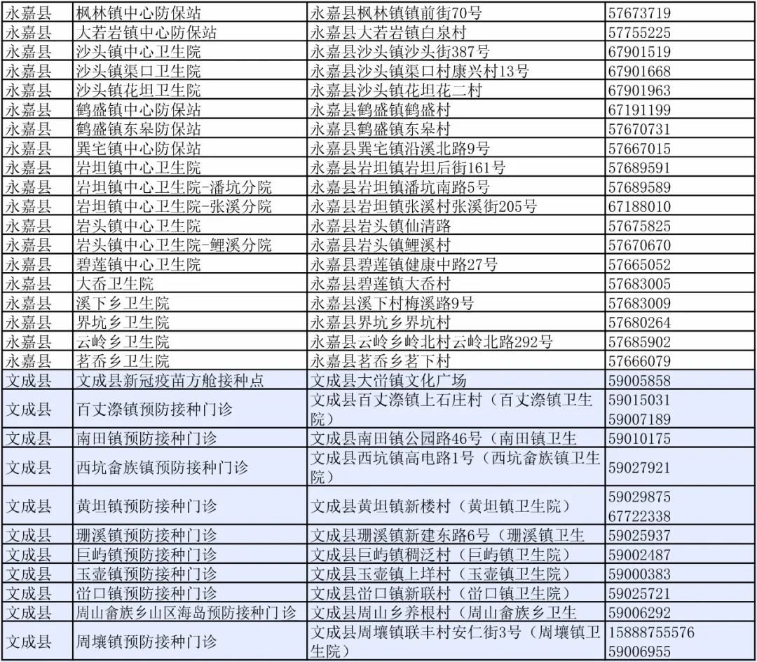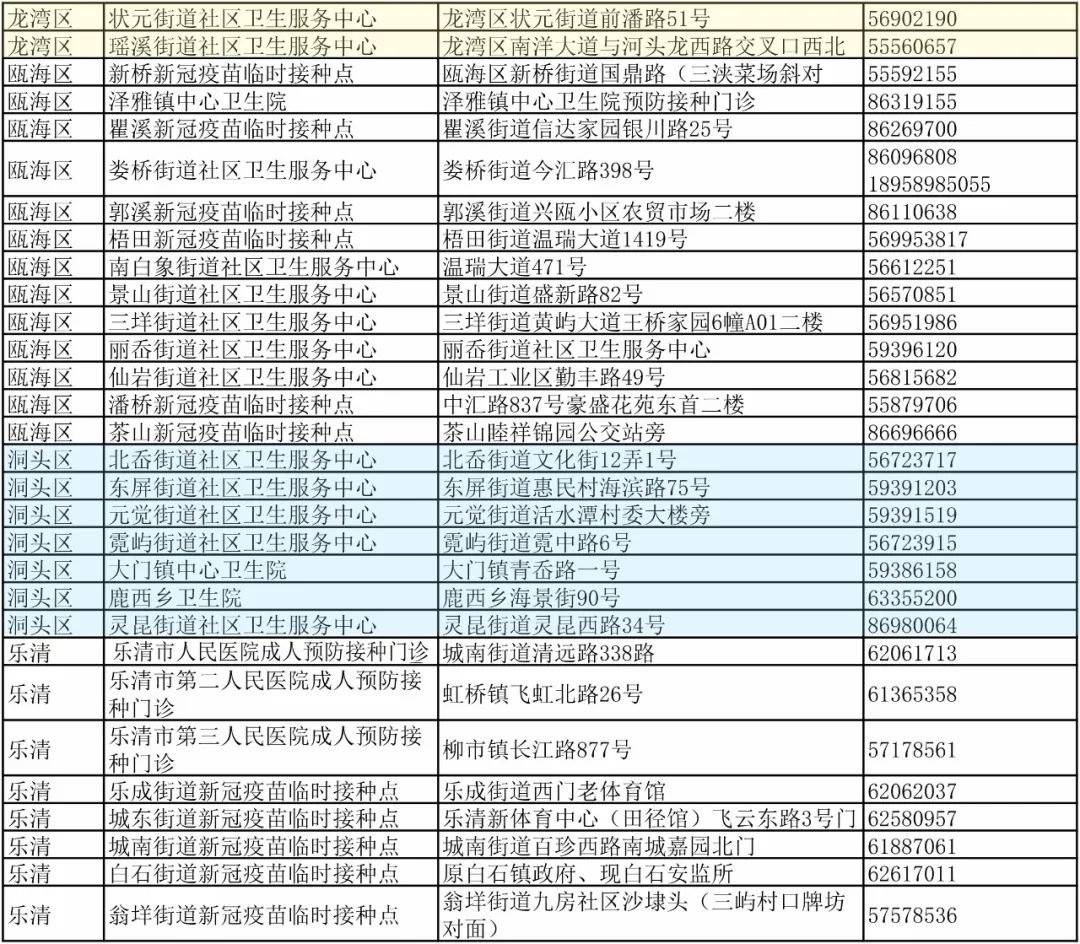 温州市各县(市、区)新冠疫苗接种门诊