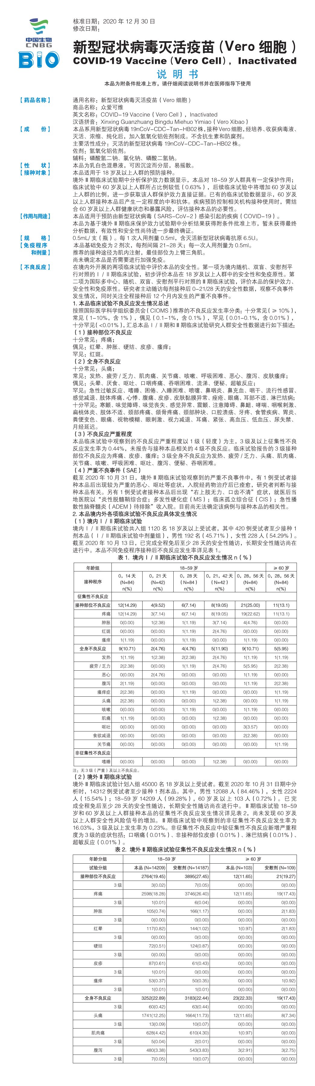 新型冠状病毒灭活疫苗(Vero细胞)