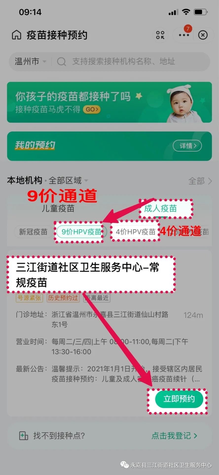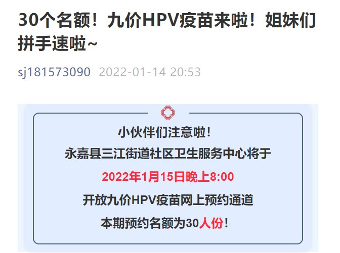 2022年1月15日:永嘉县三江街道社区卫生服务中心将于2022年1月15日晚上8:00,开放九价HPV疫苗网上预约通道!本期预约名额为30人份!
