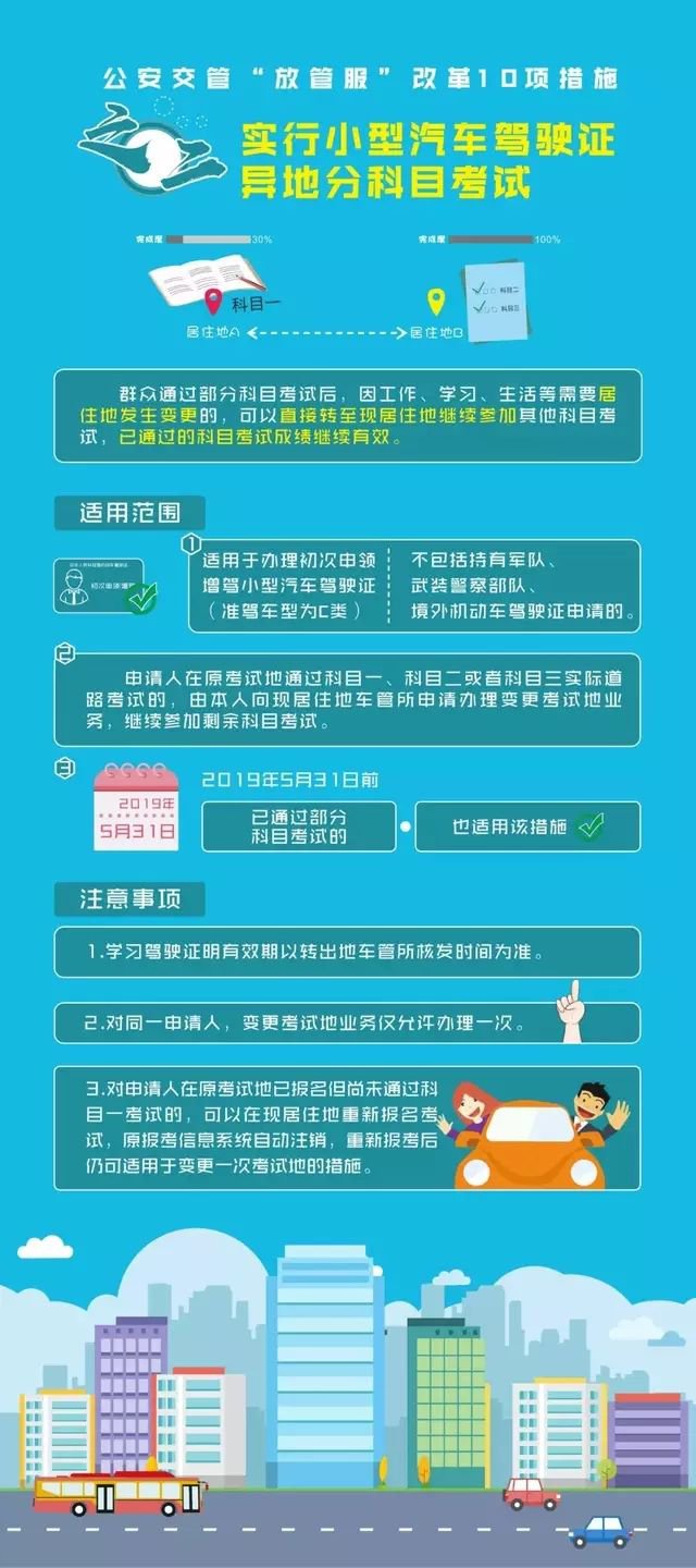 自2019年6月1日起,公安交管“放管服”改革十项措施,推行小型汽车驾驶证全国“一证通考”。
