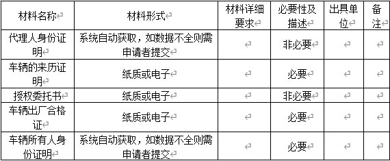本人申请:车辆来历证明/车辆出厂合格证/车辆所有人身份证明