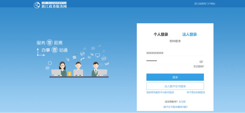 2. 点击单位申请,跳转政务网法人账号登录页面,输入账号密码登录。