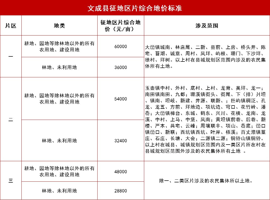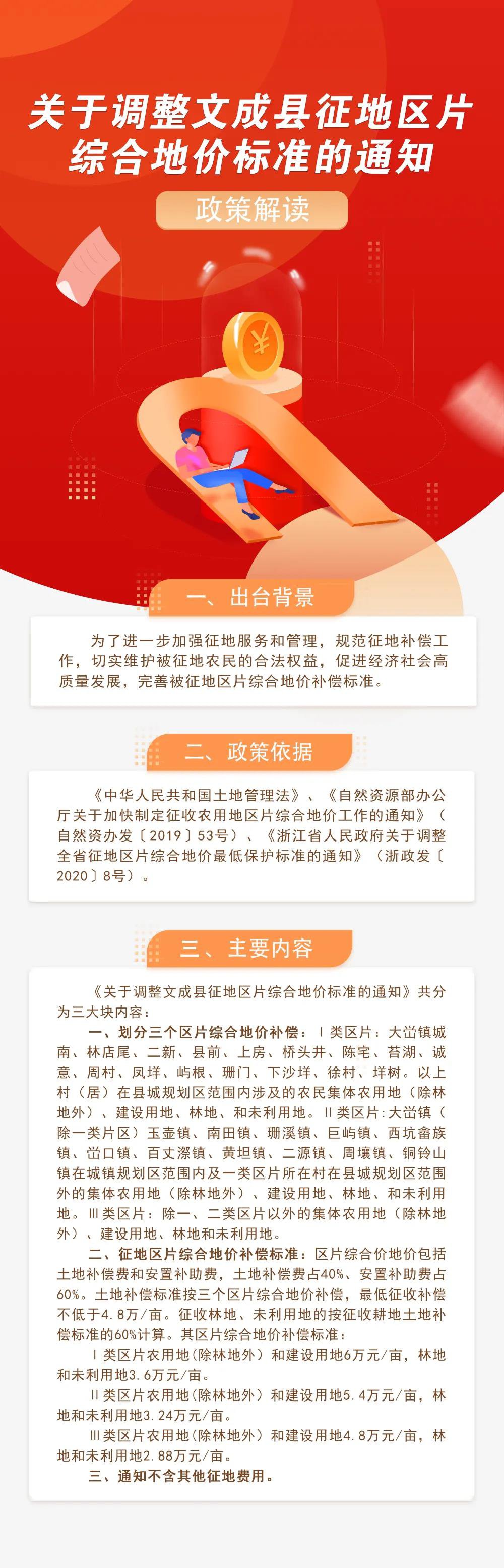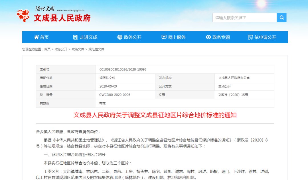 据悉,该通知自2020年10月10日实施。通知发布时,《文成县征收农民集体所有土地管理办法》(文政发〔2014〕52号)中的征地区片综合地价停止执行,征地补偿按合并后村(居)执行。