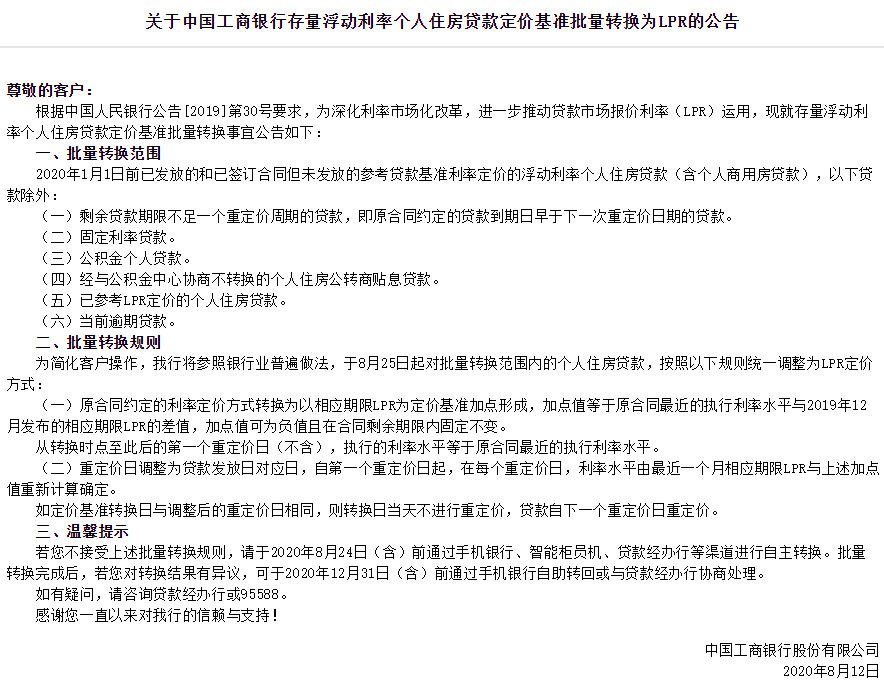 公告同时表示,批量转换完成后,若对转换结果有异议,可于2020年12月31日(含)前通过手机银行自助转回或与贷款经办行协商处理。