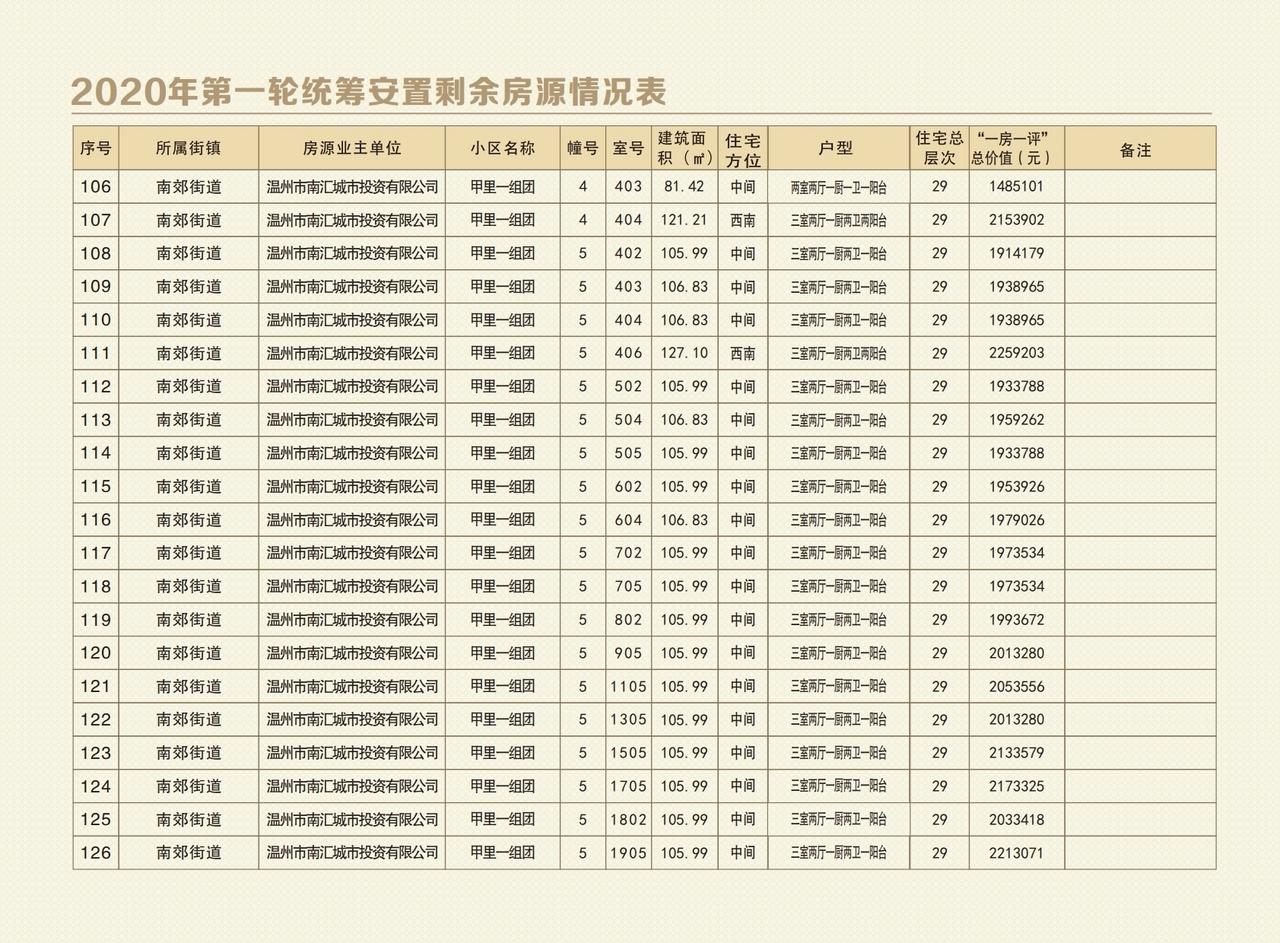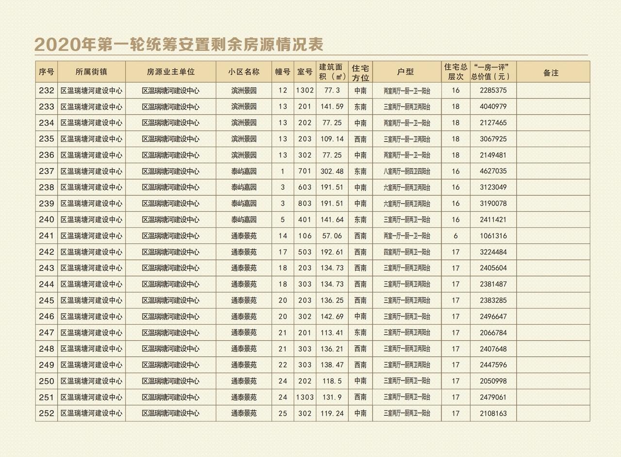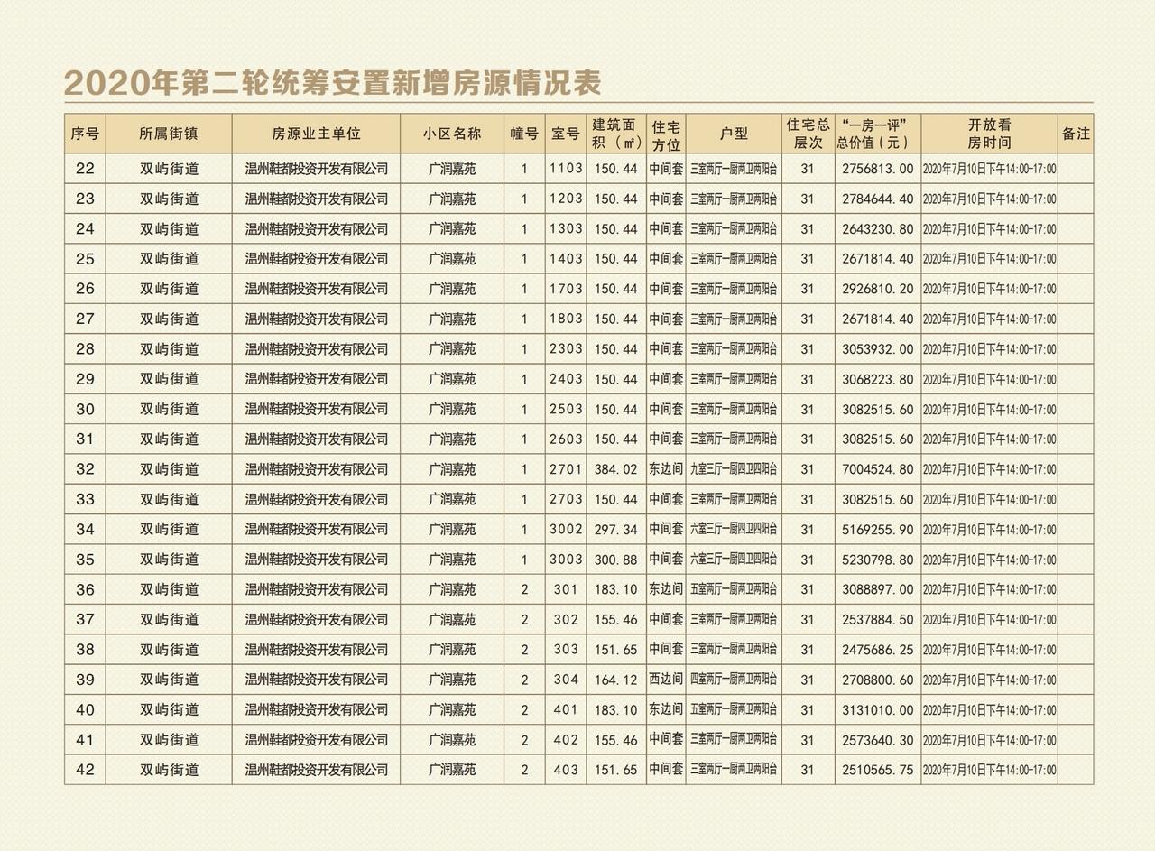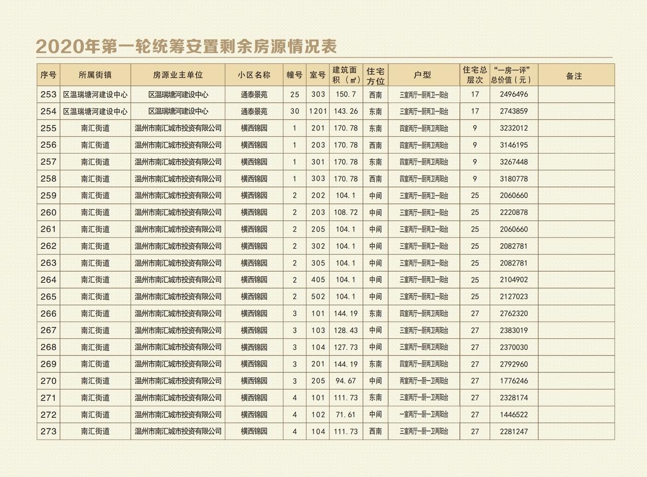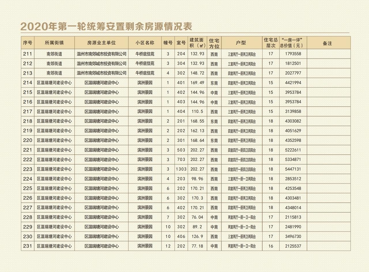 温州鹿城区第二轮统筹安置房源合计401套,面积5.23万㎡。单套面积区间57.06㎡-384.02㎡,价格区间为87.21-700.45万元。共计17个小区,包括方达嘉园、葡榕景苑、甲里一组团、甲里二组团,东立景园二至六组团、牛桥底佳苑、滨洲景园、泰屿嘉园、通泰景苑、横西锦园、绣源佳苑、广润嘉苑、京中锦园等。