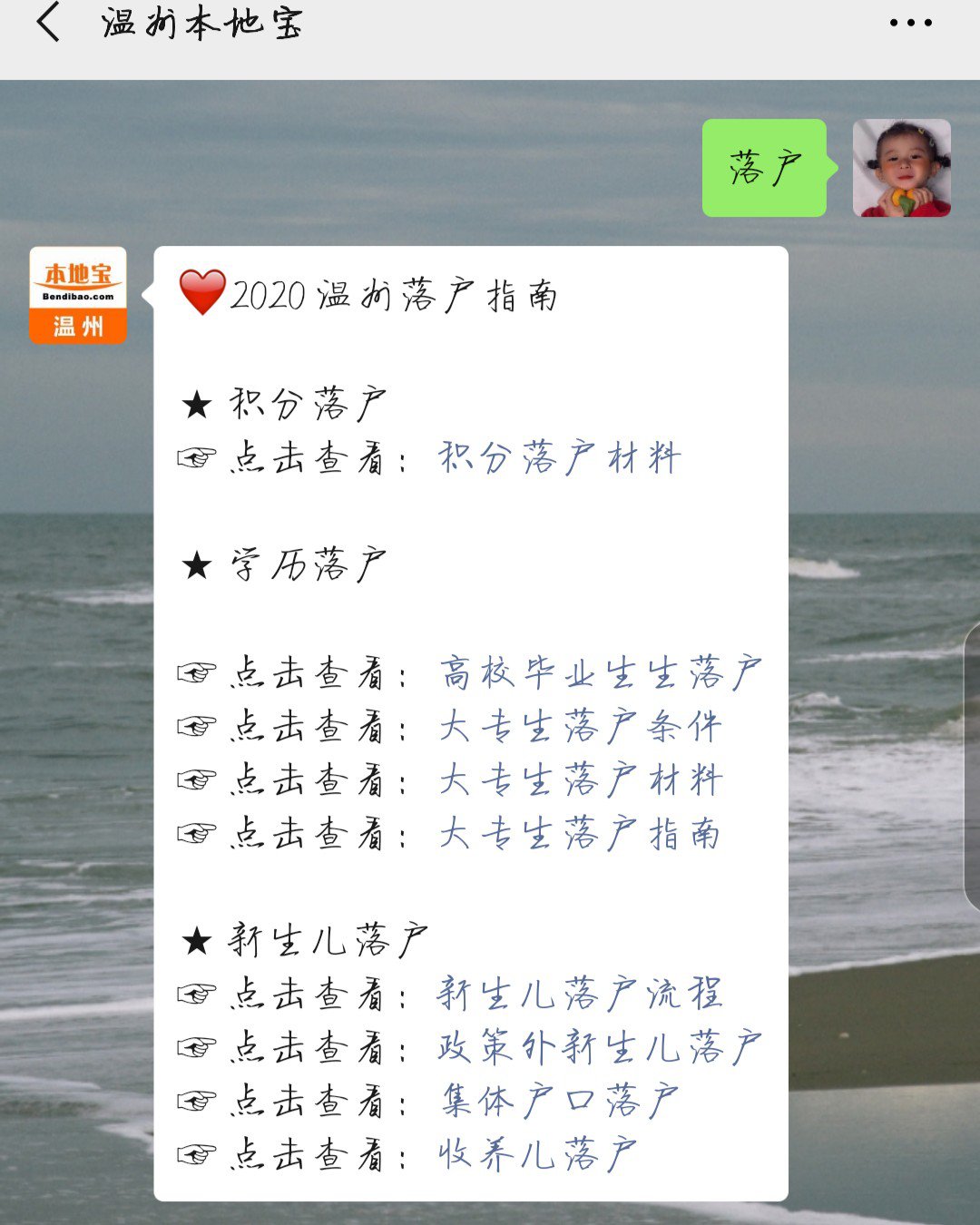 ,或微信搜索并关注温州本地宝微信公众号(ID:wenzhoubdb),在对话框内回复关键词【落户】即可查询各区县派出所、下载相关文件(入温落户申请表、同意落户证明、学信网核查记录等)、人才补贴、温州各类人才、新生儿、积分落户指南,还可以网上办理落户哦!