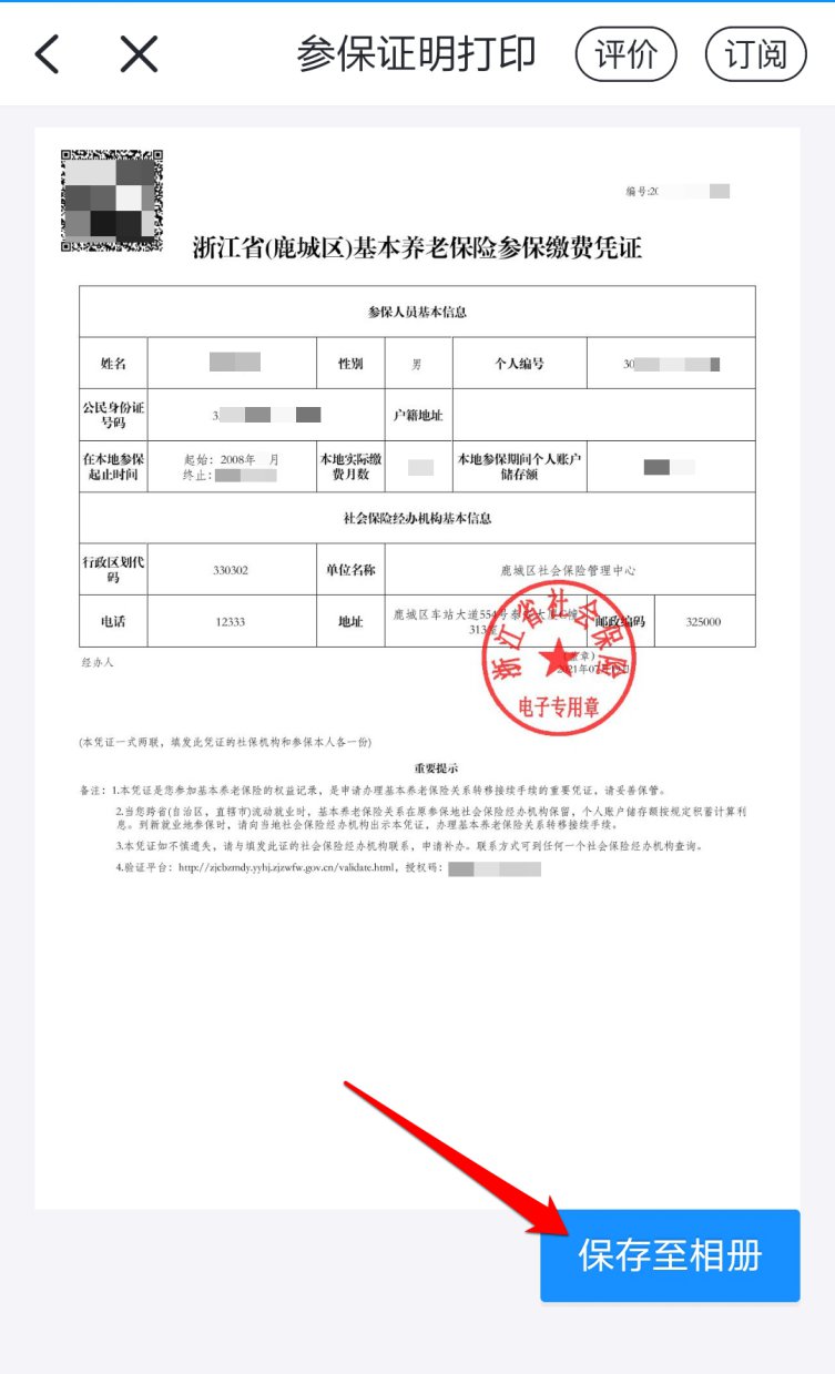 点击“保存到相册”,将生成的凭证保存到手机相册,可以发送到电脑上打印,并交至转入地的社保机构,完成职工基本养老保险的转移接续申请。