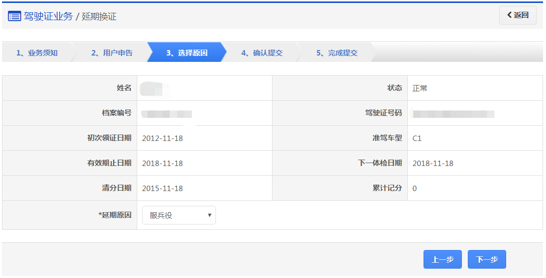 界面显示驾驶证的基本信息,用户认真确认各项信息无误后选择延期原因,点击【下一步】进入步骤4【确认提交】。