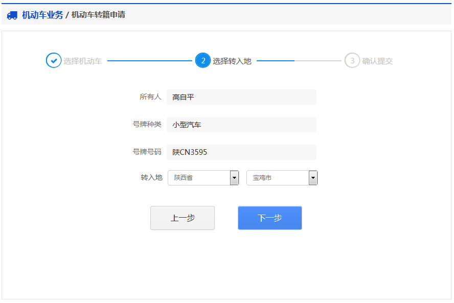 步骤4:【确认提交】 该步骤显示用户的车辆信息、转入地信息。