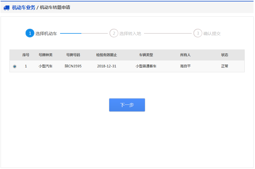 步骤1:【选择机动车】 用户选择已备案的本人机动车,如下图所示。选择完成后,点击【下一步】,进入步骤2【选择转入地】。