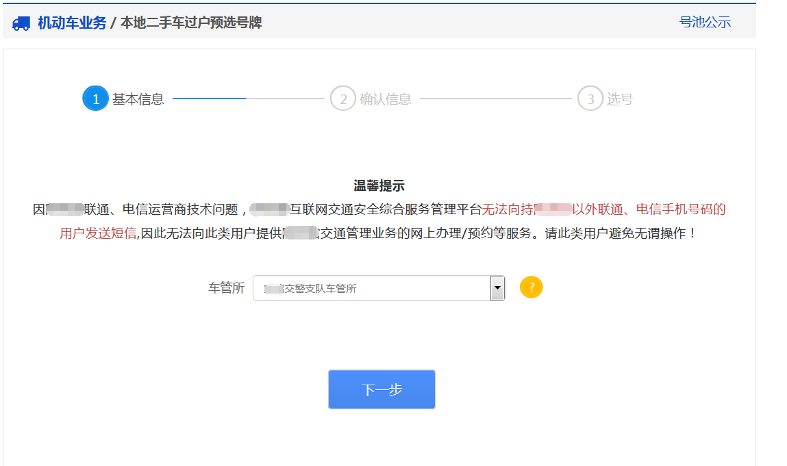 用户通过该功能可以为自己名下原登记地为本地的二手普通小型汽车预选号牌(详情请阅读预选号牌业务须知 ), 选号之前请预先准备好“机动车登记证书”。用户在预选号牌过程中,需要录入登记证书编号、“车辆识别代号”(也叫车架号) 和卖方身份信息,同时,接收并录入手机短信验证码以验证本人预选号牌操作的真实性。