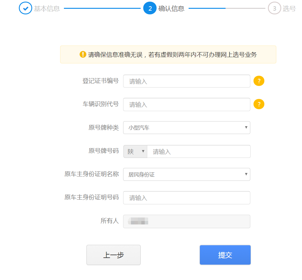 在该步骤,用户需要录入新购二手小型汽车的登记证书编号、车辆识别代号和卖方信息,如下图