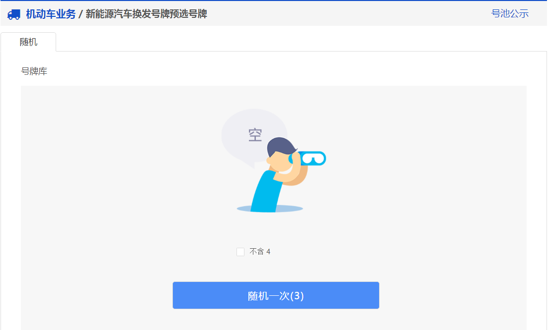 【预选号牌】 换发新能源汽车号牌预选号牌业务只提供随机选号方式,如下图所示。