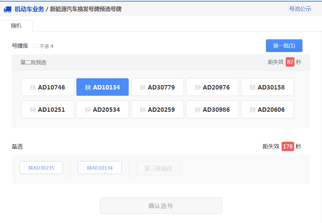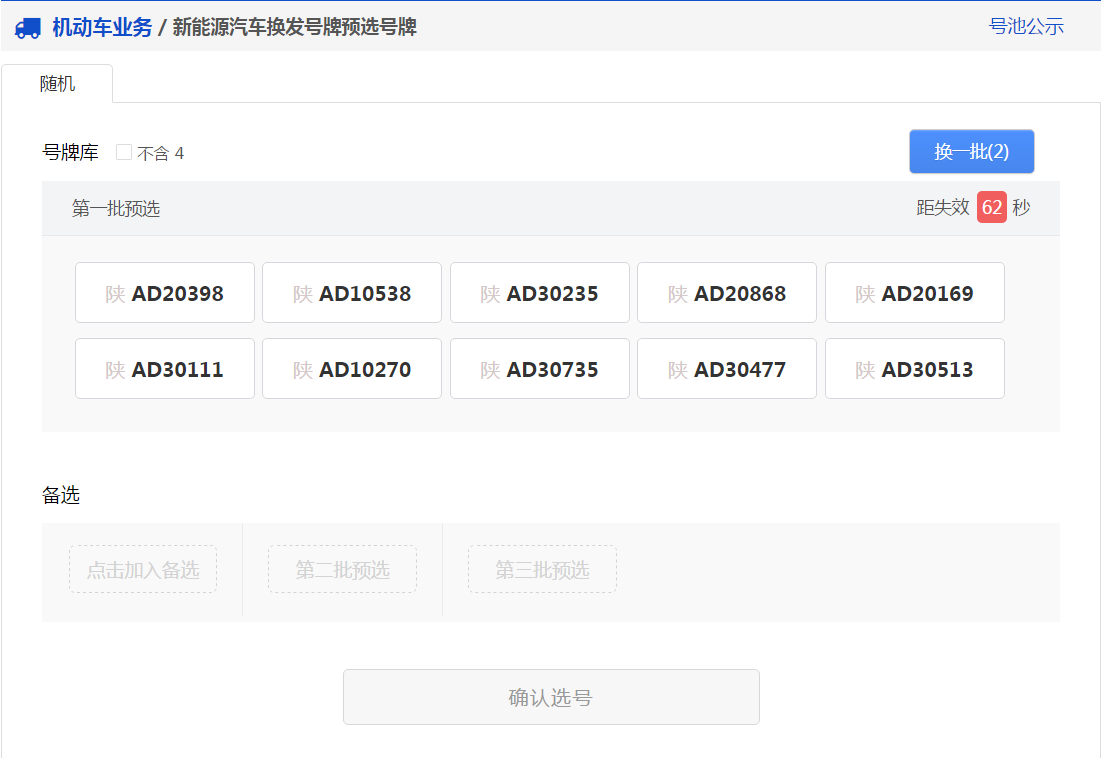 用户可以点击右上角“换一批”按钮重新进行随机(“换一批”后面的括号中的数字为用户当前选号车辆的剩余随机选号次数),此时会更新随机号牌栏中的号牌。 如果备选号牌栏中的有号牌并且没有失效,则备选栏中的倒计时将重新开始倒计时。 用户可以在新随机的号牌号码中选择一个号牌号码作为备选号牌,此时备选栏中的倒计时也将重新开始倒计时。如下图所示