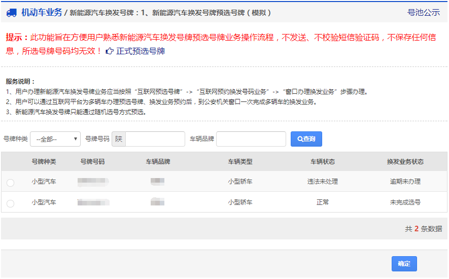 用户通过该功能可以为自己或单位名下的新能源汽车换牌预选号牌(详情请阅读新能源汽车换牌选号业务须知 )。