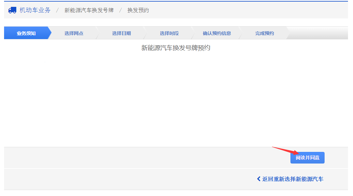 在该步骤,请用户认真阅读其业务须知的内容,其中包括了换牌预约需要注意的各项条款和免责声明等内容。点击【阅读并同意】,进入步骤3。
