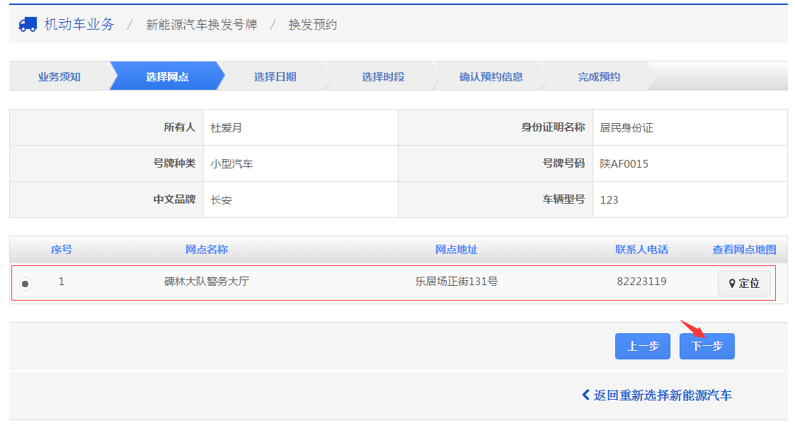 在该步骤,用户需要选择办理换牌预约的网点。点击【下一步】,进入步骤4。