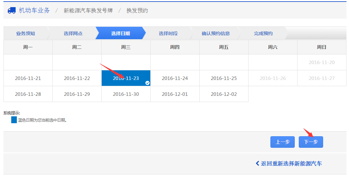 在该步骤,用户可以根据个人情况选择换牌预约的日期。选择后,点击【下一步】,进入步骤5。