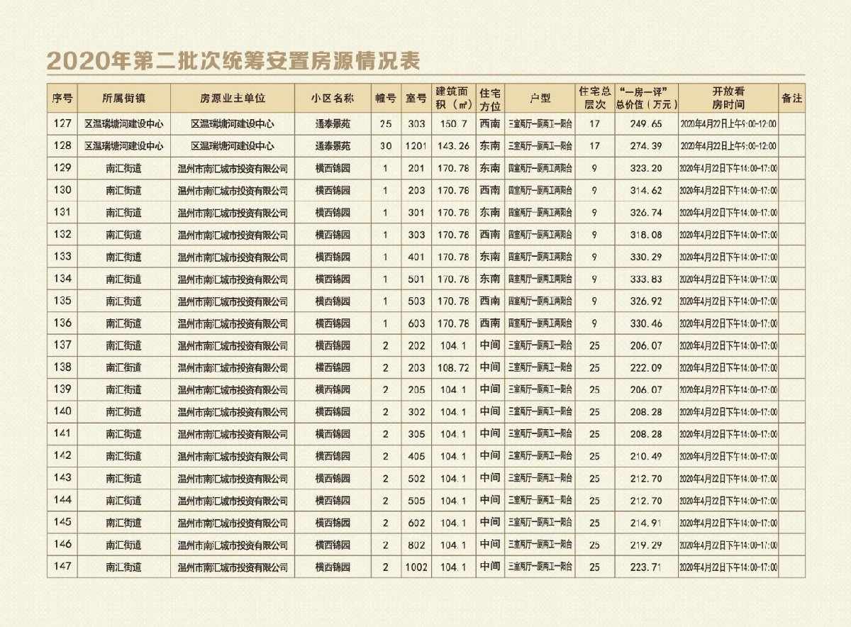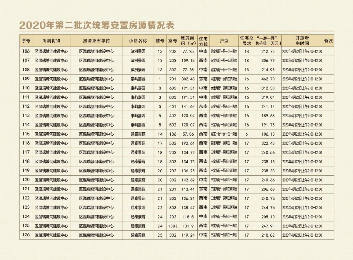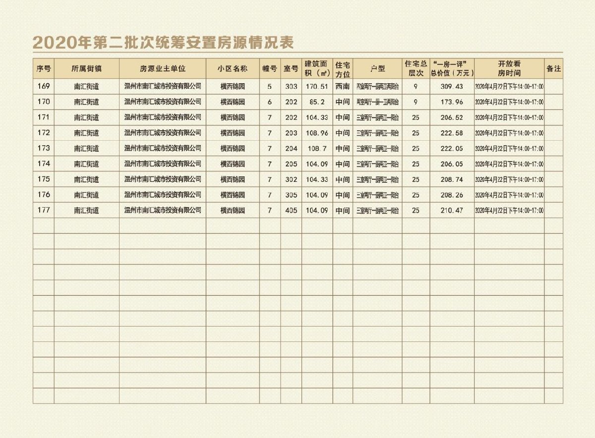 鹿城第二批次统筹安置房源合计177套,面积22978.28平方米。单套面积区间为57.06平方米—302.48平方米,价格区间为106.13万元-544.71万元,包含东立景园二组团、四至六组团、牛桥底佳苑、滨洲景园、泰屿嘉园、通泰景苑及横西锦园。