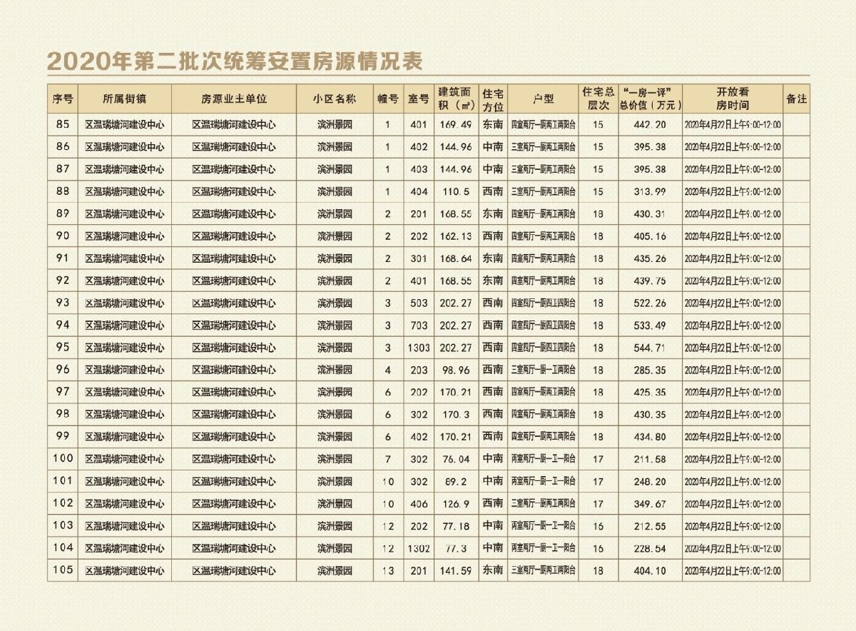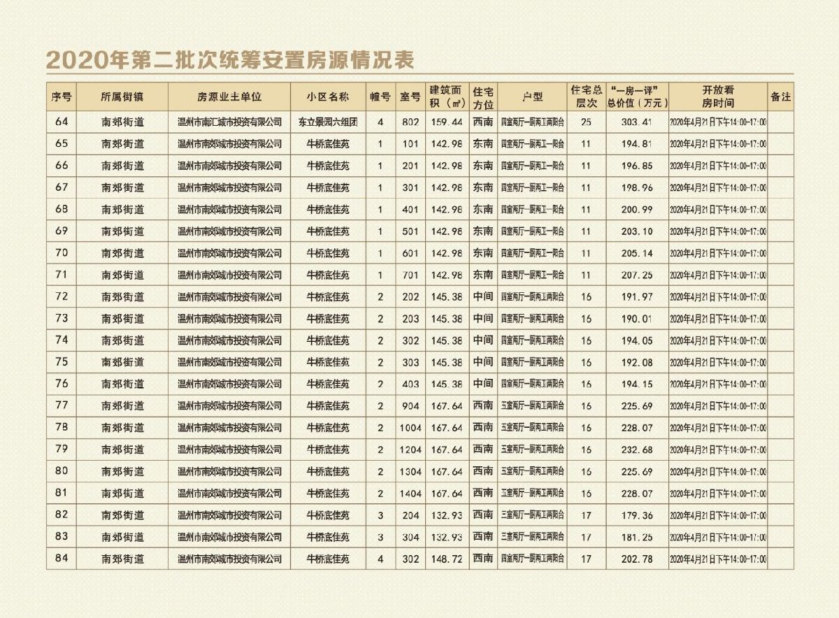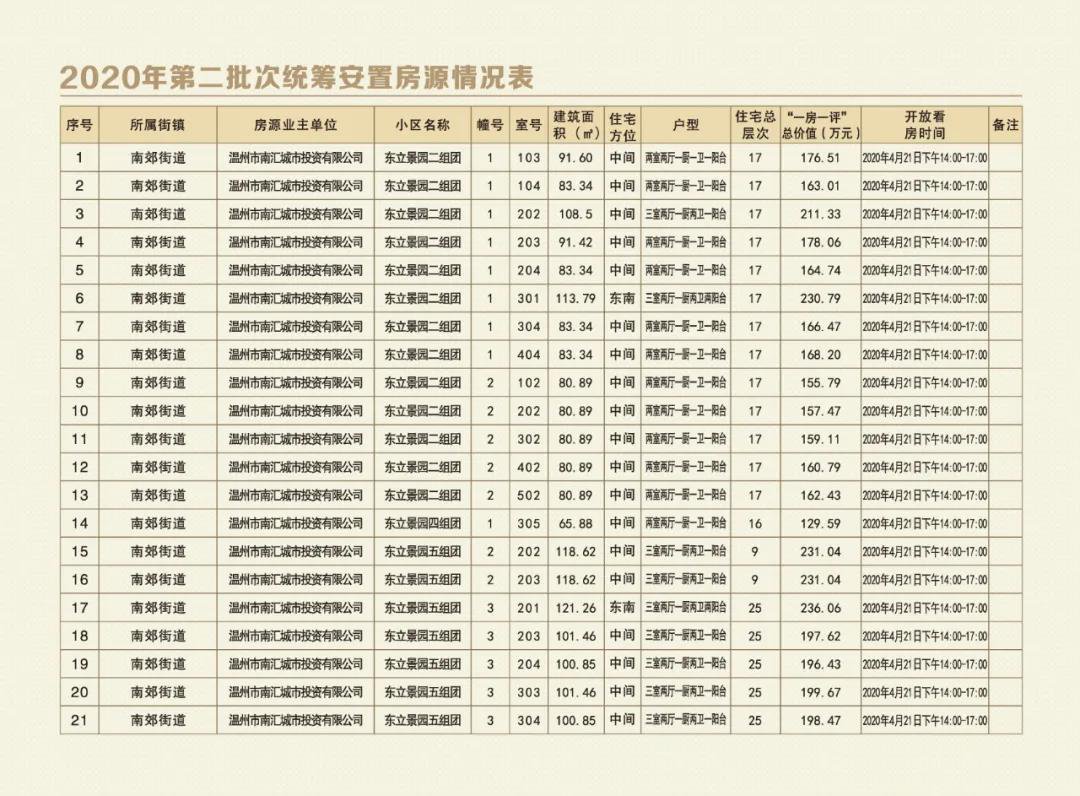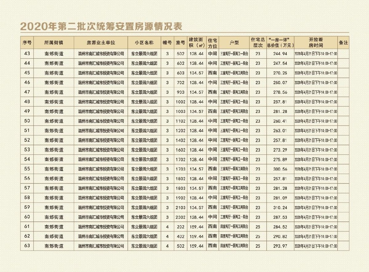 鹿城第二批次统筹安置房源合计177套,面积22978.28平方米。单套面积区间为57.06平方米—302.48平方米,价格区间为106.13万元-544.71万元,包含东立景园二组团、四至六组团、牛桥底佳苑、滨洲景园、泰屿嘉园、通泰景苑及横西锦园。