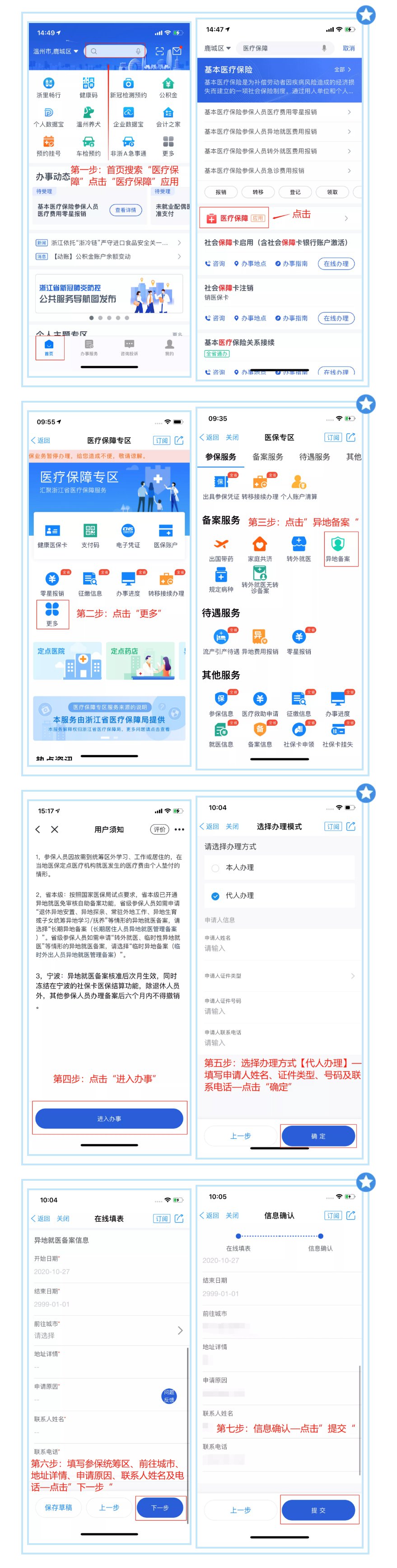 操作步骤:注册登录浙里办APP——首页搜索“医疗保障”并点击“医疗保障”应用——点击更多——点击异地备案——阅读用户须知——点击进入办事——选择办理方式【本人办理】——点击确定——填写参保统筹区、前往城市、地址详情、申请原因、联系人姓名及电话——信息确认并点击提交。