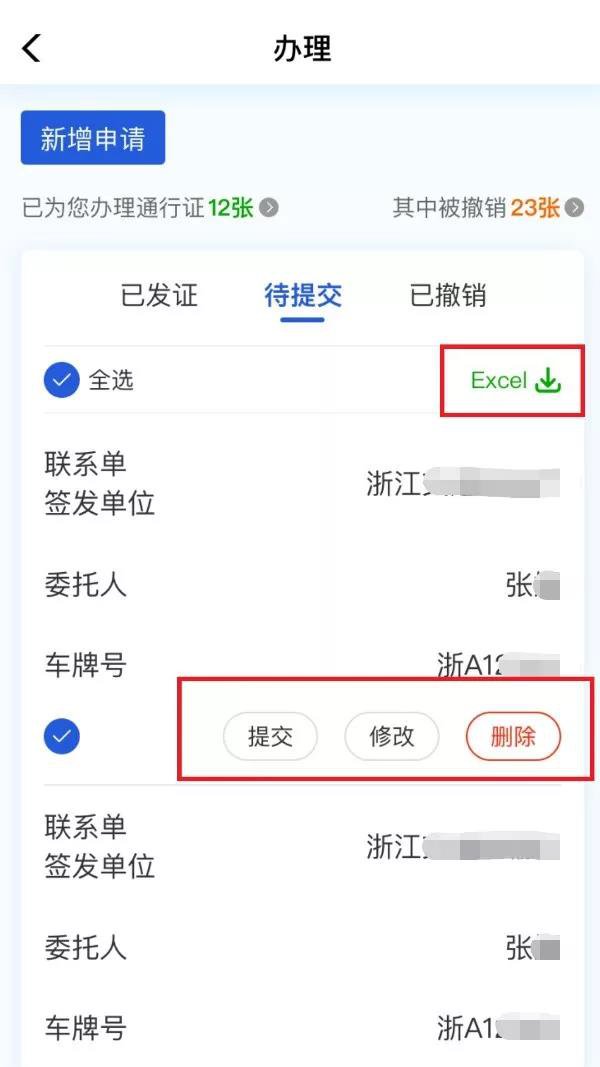 可以对保存的信息进行提交、修改、删除操作,也可以点击“EXCEL”批量导出表格。