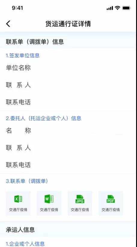 填写联系单(调拨单)信息、承运人信息、物资信息、通行信息、通行证签发部门所在区域等信息。