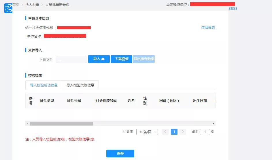 导入成功后,点【保存】按钮即可。完成后的业务可在【单位业务申报进度查询】中查看业务审批状态。