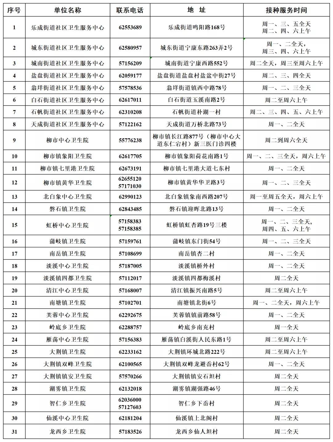 温州乐清市预防接种门诊信息一览表