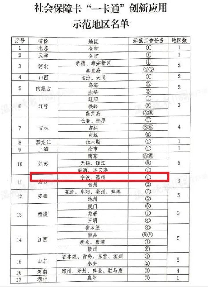 国家人社部近日发布《关于开展社会保障卡“一卡通”创新应用示范工作的通知》,人社部将在全国开展为期半年左右的“一卡通”创新应用示范建设工作,示范工作分为综合示范和专项示范两项工作任务。在综合示范这项任务中,包括宁波、温州在内的多个地区入选。