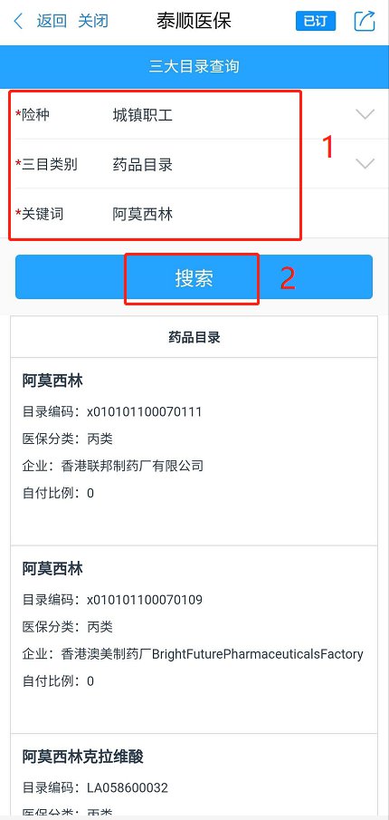 第六步:点击“三大目录查询”,以“阿莫西林”为例,选择险种、目录并输入药品名称,即可查询药品目录编码和医保分类等信息。