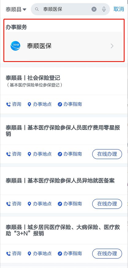 第二步:首页查找搜索“泰顺医保”,并点击进入“泰顺医保”订阅号界面;(关注订阅号后,便可在“更多”选项中直接进入“泰顺医保”订阅号)