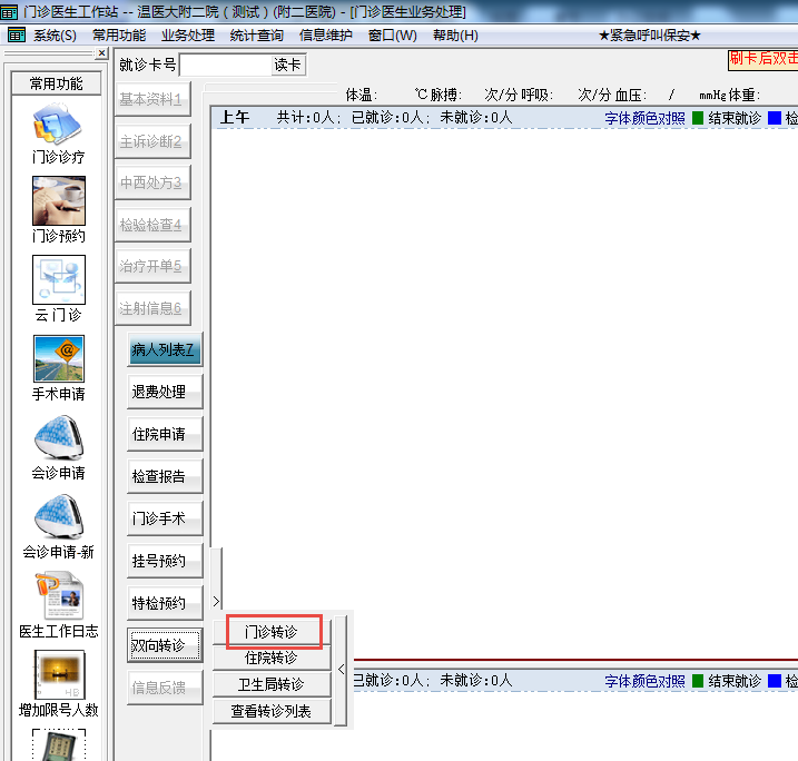 一般是下级医院向附二本部医生发起门诊转诊。登录门诊医生,选择【双向转诊】->【门诊转诊】。