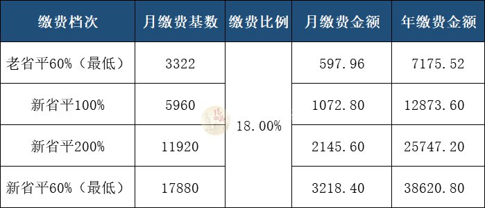 最低缴费基数精确到元,同时将缴费基数=“老省平”5536元的100%、200%、300%的参保人员,按“新省平”5960元的对应比例启用,缴费比例为18%,具体如下↓