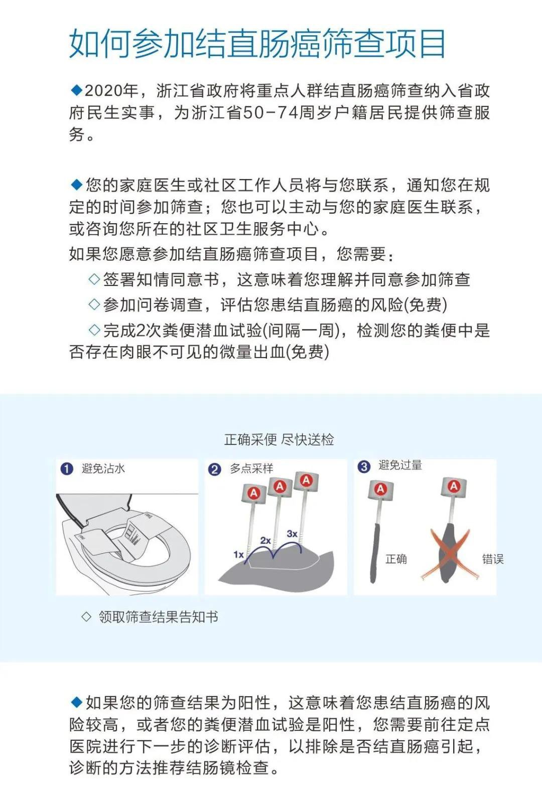 如果您今年参加结直肠癌筛查项目,您需要1.签署知情同意书;2.免费参加问卷调查评估您患结直肠癌的风险;3.免费完成1次粪便潜血试验。