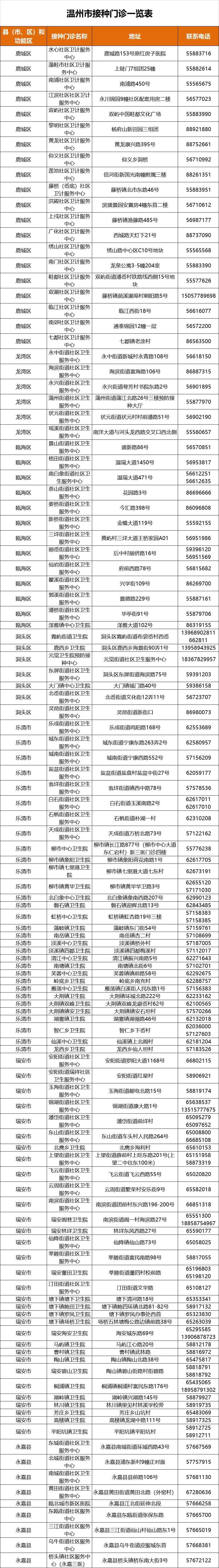温州市预防接种服务机构恢复接种门诊一览表(最新)
