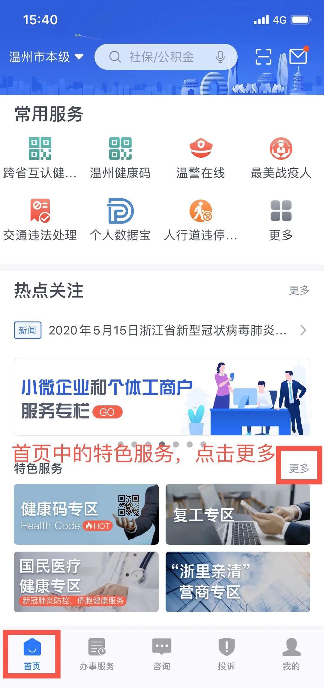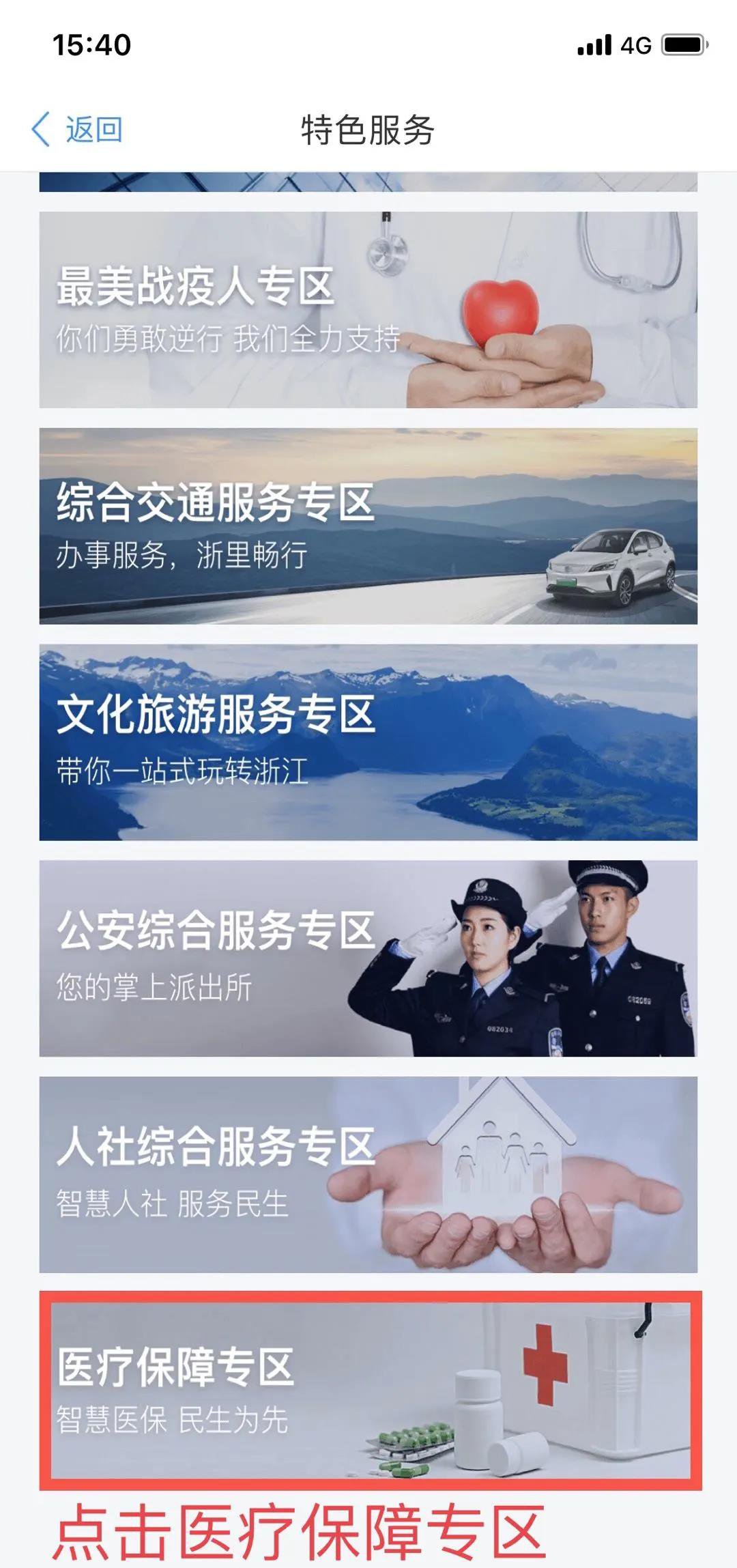 2. 注册登录浙里办APP——找到首页中特色服务,点击更多——点击医疗保障专区(或搜索医疗保障)。