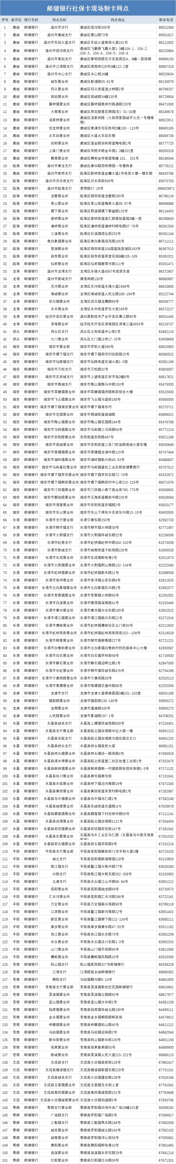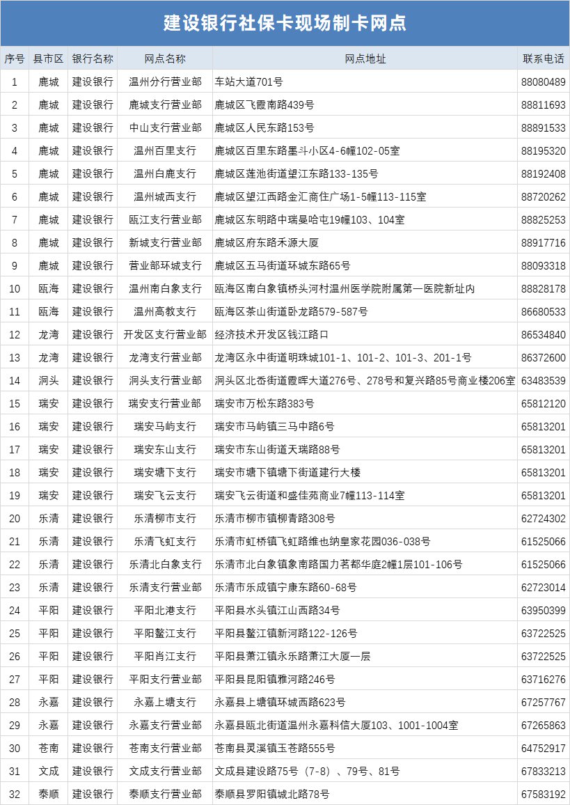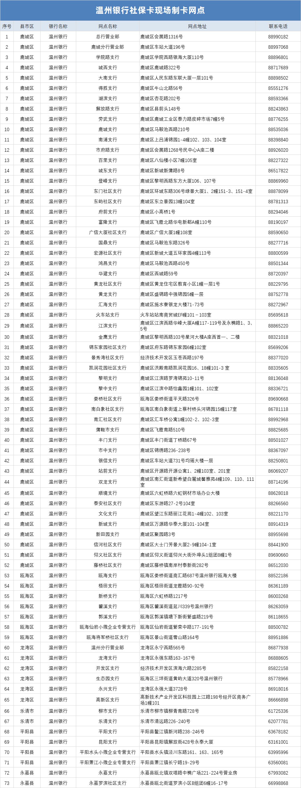 目前,温州市工商银行、农业银行、中国银行、建设银行、交通银行、邮储银行、温州银行、农商行等部分网点均可申领第三代社保卡。市民在全市8家合作银行1061个网点均可办理相关业务。