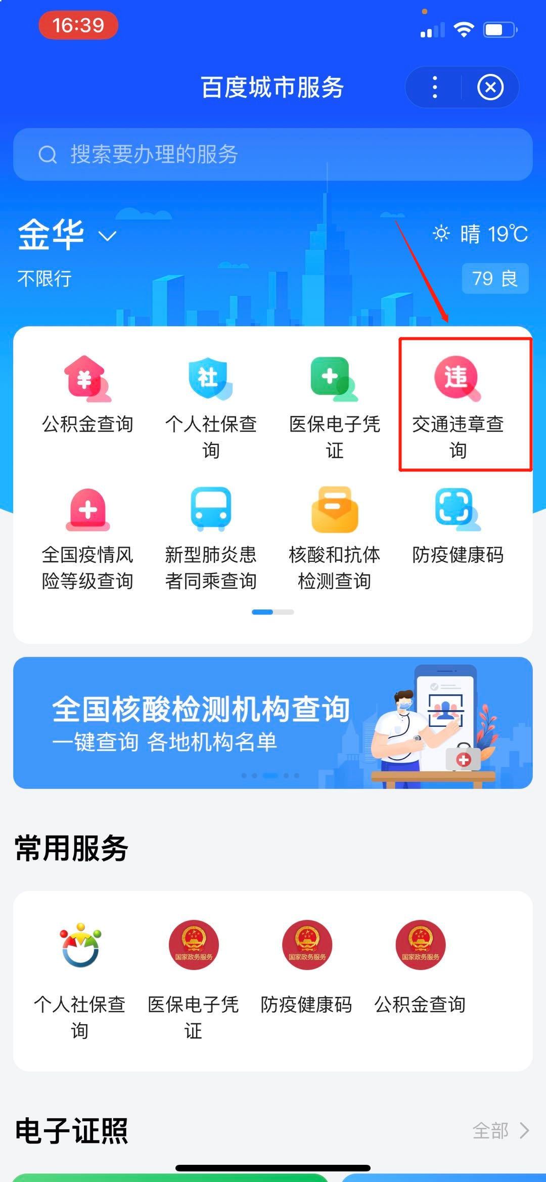 百度城市服务小程序:点击『交通违章查询』