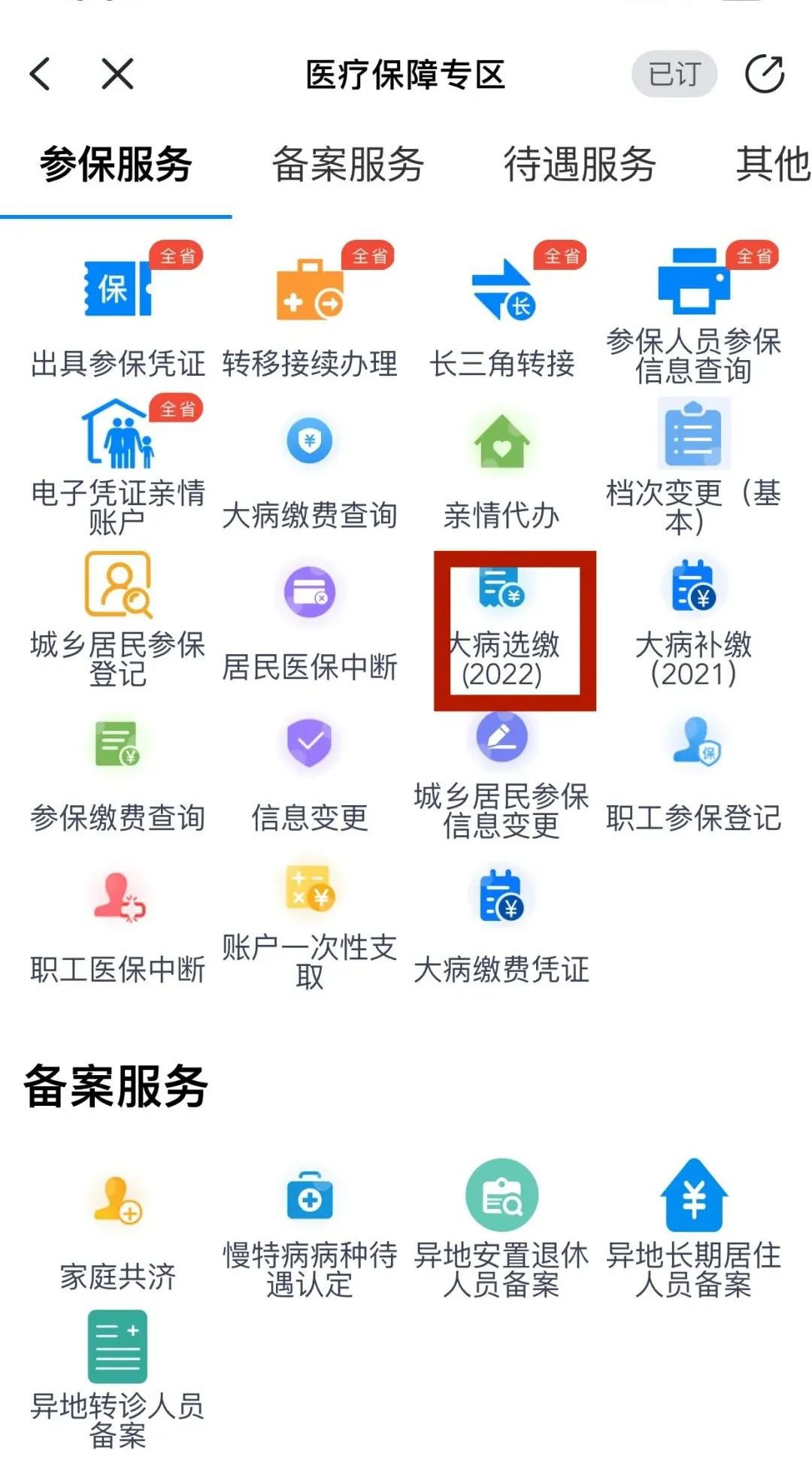 1、进入医疗保障专区→点击“更多”后,选择“大病选缴(2022)”按钮
