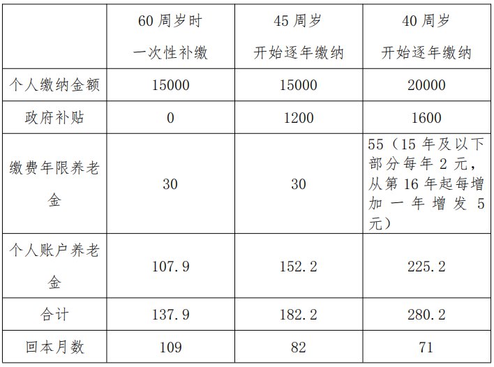 城乡居民基本养老保险跟职工基本养老保险一样,只要满15年就可以按月享受待遇,而且又不需要像职保那样按月缴费,可以一次性补缴,我今年40岁,等60岁的时候再来一次性补缴是不是更划算?